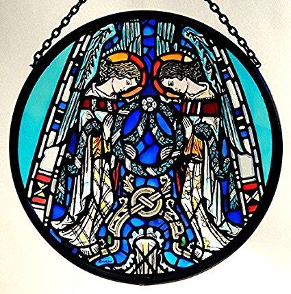 Glasgow Cathedral - Praising Angels Roundel - 6" diameter hand painted glass window roundel with chain, designed and made in the borders of Scotland and Cumbria. Gift boxed in burgundy. Window suction cup included. Window 'Roundels' are round glass decorations designed to hang in a window of the home. Various sizes of Roundel are produced by hand-painting directly onto the glass. The Window Art Roundels and Panels are framed with traditional stained glass lead, and hung with trace chain. All products are supplied with window suction cups.