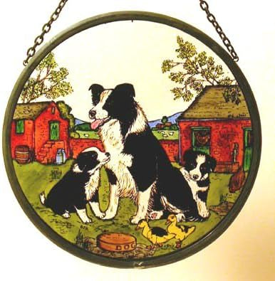 Hand Painted Stained Glass Roundel - Collie Dog and Pups (6")
