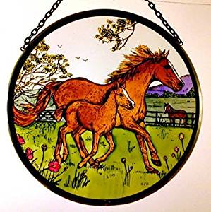 Hand Painted Stained Glass Roundel - Horse and Foal (6")