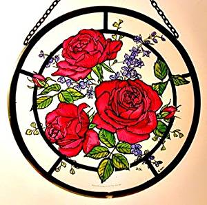 Red Roses Roundel - 6" diameter hand painted glass window roundel with chain, designed and made in the borders of Scotland and Cumbria. Gift boxed in burgundy. Window suction cup included. Window 'Roundels' are round glass decorations designed to hang in a window of the home. Various sizes of Roundel are produced by hand-painting directly onto the glass. The Window Art Roundels and Panels are framed with traditional stained glass lead, and hung with trace chain. All products are supplied with window suction cups.